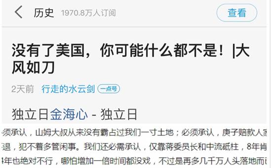 一点号“行走的水云剑”发布文章《没有了美国,你可能什么都不是》。文章否认了中国共产党在抗日战争中的中流砥柱作用,将抗日战争的胜利归因于美国的介入,歪曲历史、颠倒是非,严重背离社会主义核心价值观。