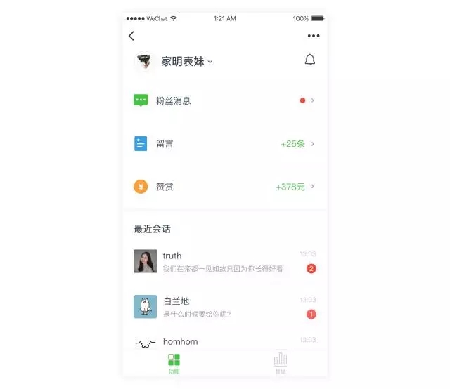 2、【公众平台助手】小程序支持公众号管理员及运营者在手机端更加方便及时地回复用户消息、管理留言和赞赏、查看通知;
