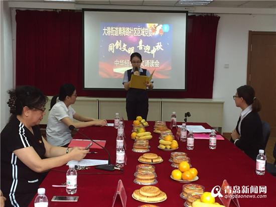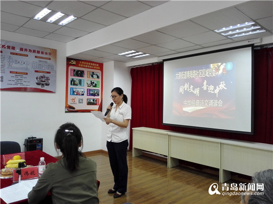 在中秋节来临之际,以“同创文明 喜迎中秋”为主题的区域化党建活动中华经典诗文诵读比赛在大港街道青海路社区文化活动室举行,青海路社区六家区域化党建共建单位的在职党员参加了比赛,传承和弘扬中华传统节日文化,用诗的语言表达对祖国大地的讴歌和热爱。