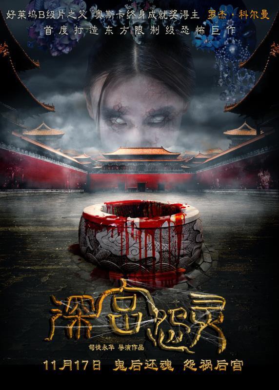 电影《深宫怨灵》根据民间广为流传的清朝珍妃含恨跳井、冤魂复仇的后宫传说改编,讲述了跨越300年时空,三条故事线交织在一起的神秘灵异惊天奇案。好莱坞久负盛名的惊悚片之王、奥斯卡终身成就奖得主罗杰·科尔曼为影片操刀监制,这是“B级片之父”第一次进军中国内地大银幕,令中美惊悚片影迷十分期待。电影糅合了美式的大尺度视觉风格与东方诡异幽怨的神秘元素,开创了后宫灵异这一惊悚电影新类型。影片既在视觉上增加了血腥尺度,又以不寒而栗的惊悚氛围直击观众内心,让人细思极恐。电影中港美跨国演员阵容强大,实力派演员齐聚为影片助力,使观众更有代入感。此次曝光的先导海报中,空旷诡异的深宫大殿前一口罗刹井,井眼满溢鲜血,阴云密布的天空之上一张凄怨阴郁的女鬼脸庞笼罩着整座宫廷,惊悚氛围呼之欲出夺人心魄。