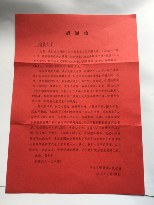 近日,一封来自湖南的感谢信跨越千里,被送到了位于北京的国美总部。这是一封饱含着4.2万湖南省宁乡县资福镇人民感恩的信函,记录着国美人与资福人之间的深情厚谊。