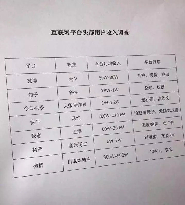 最终的差别其实就内容创业者很难在头条平台上赚到钱,一位从业者表示,“今日头条平台承诺给优质账号更多的推荐曝光,很多时候都是只给优质内容曝光,如果发的是广告或者营销内容,就得不到曝光”。不久前一张关于互联网平台头部用户收入也说明了一些问题。除了快手这个特殊之外,平台对内容分发的掌握权越强,头部作者所能获得的平均收入反而会越少。