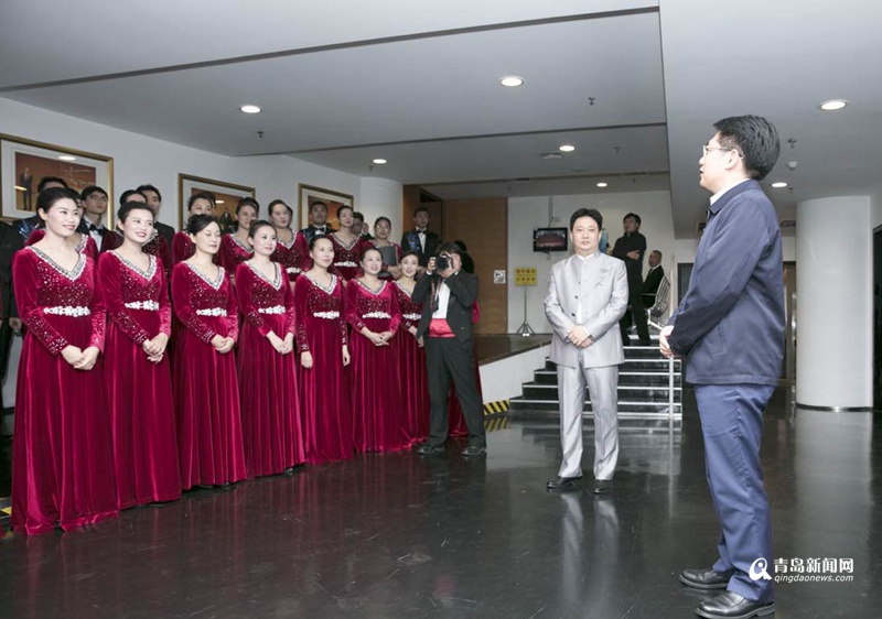 青岛市委常委,市高校工委书记,市教育局党委书记、局长邓云锋亲切会见全体团员并发表了热情洋溢的讲话。邓局长首先对教师合唱团成立至今默默奉献的精神提出表扬,对历年来取得的骄人成绩表示祝贺,并对合唱团在“以文化人、以美育人”方面的贡献表示赞赏;他指出,青岛2016年刚刚承办了全国五艺展,学校美育工作应继续保持和发扬排头兵的优势,教师合唱团专场音乐会就是有力的延伸和风采的展示;他强调,学校美育工作要深入贯彻落实十九大精神,进一步创新美育形式,深入校园、植根课堂,期待全体团员能再接再厉,唱响新时代中国特色社会主义的主旋律,更好地服务校园、服务学生,努力培养新时代合格接班人。