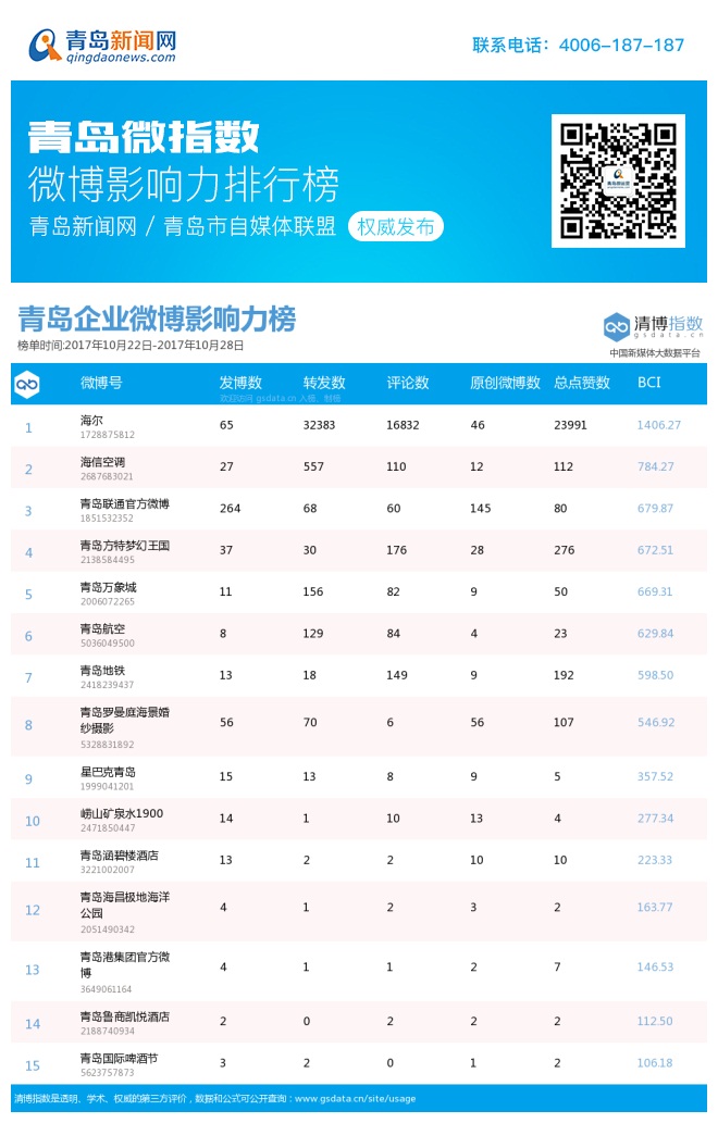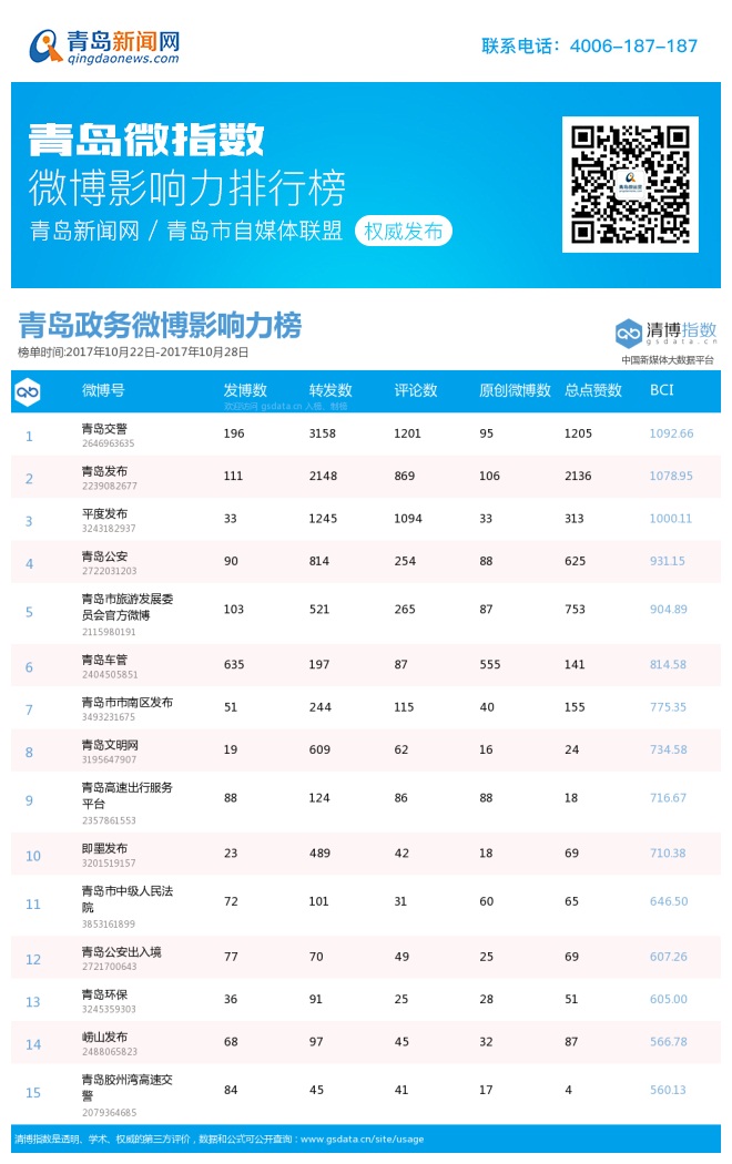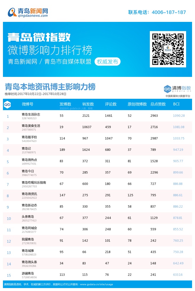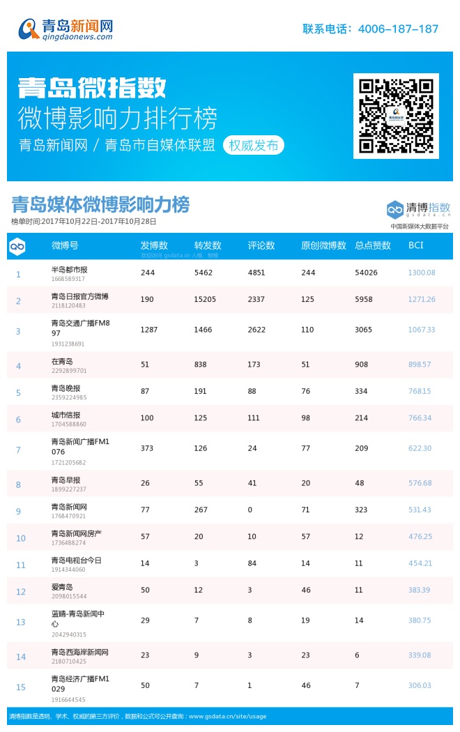 由青岛新闻网联合清博指数平台联手打造的“青岛微指数微博影响力排行榜”,通过对各行业微信公众号的日常监测,对所有账号在统计周期内所发布内容的发文总数、总阅读数、转发数、评论数及总点赞数等海量数据进行分析,帮助各行业新媒体小编更好地运营微博。