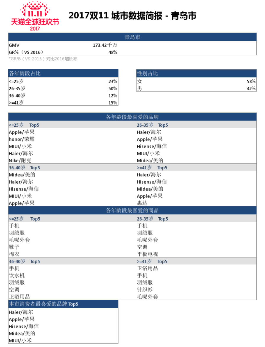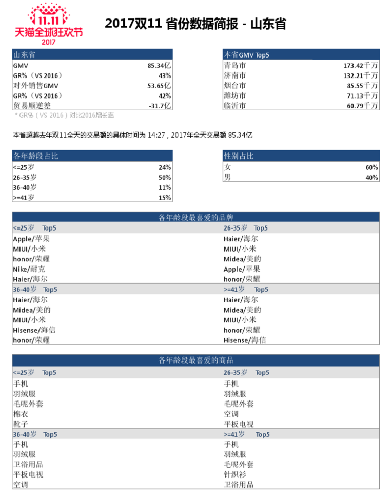 2017年的天猫双十一,整个山东地区一共花费了85.34亿元,比去年同期增加43%。青岛人则贡献了17.34亿元,比去年增加了48%,在山东省内排名第一。排在第二位的是济南,一共花费了13.22亿元,烟台人则以8.55亿元排名第三,前三名顺序与2016年保持一致。
