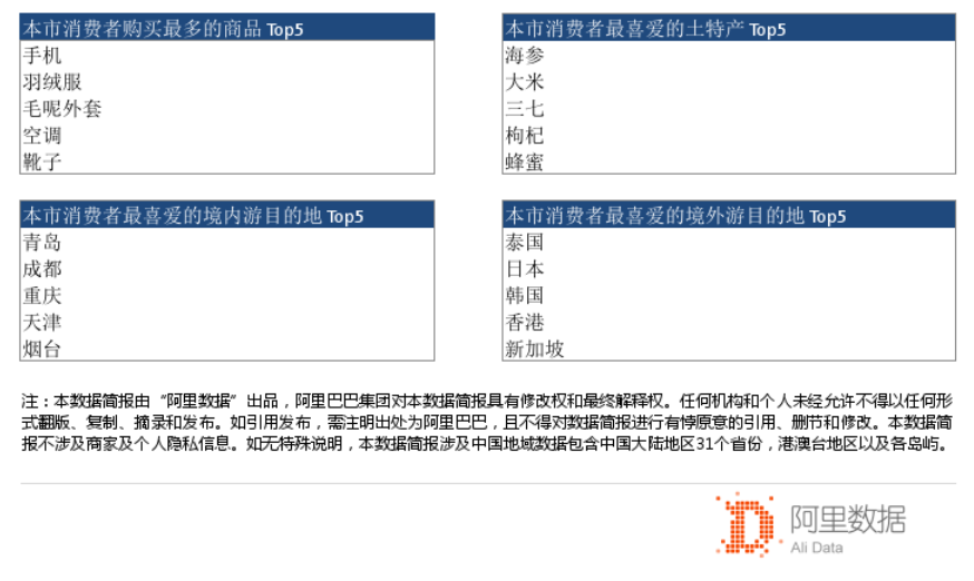 除此之外,青岛市民最喜欢的土特产是海参,其次是大米、三七、枸杞和蜂蜜。青岛人最喜欢去的境内游目的地分别是青岛、成都、重庆、天津、烟台,而境外游则是泰国、日本、韩国、香港和新加坡。