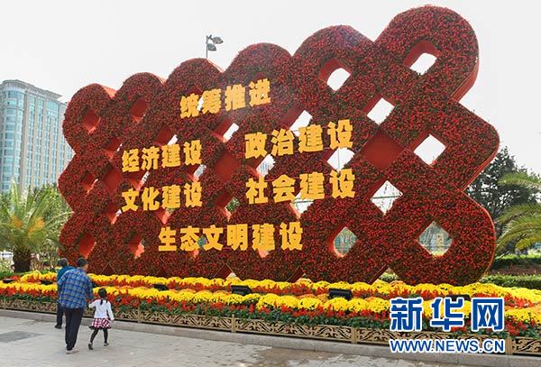 这是2017年10月1日在北京东单路口拍摄的“五位一体”花坛。新华社记者李贺摄