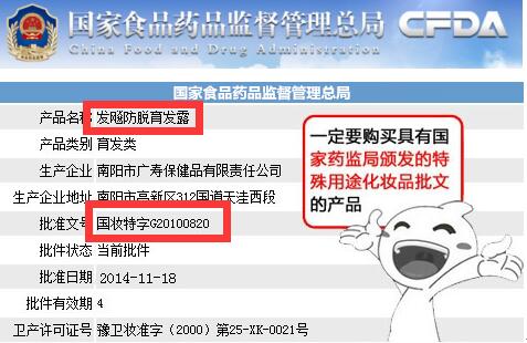 根据国家食品药品生产监督条例等相关法规规定,育发、祛斑、防晒等化妆品属于特殊用品化妆品,必须经有国家食品药品监督管理总局批准,取得批准文号(即“特字号”)后方可生产销售。此编号是可以从国家食品药品监督管理局的网站上查询到的。国妆特字是属于特殊用途化妆品的批准文号,是由国家卫生部颁布的,不仅卫生、质量、细菌菌群等均符合标准外,还具备特殊用途,即特殊用途化妆品有育发、祛斑、防晒等功能型。所以具有国家药监局正规批准的生发液都是有用的。