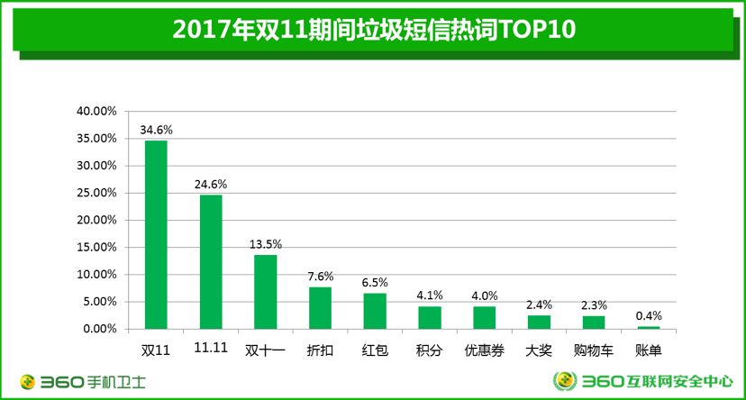 从垃圾短信内容来看,在双十一期间,几乎所有的垃圾短信都会以“双十一”为主题。统计显示,约有七成以上的垃圾短信,会使用“双11”、“11.11”、“双十一”等词汇。此外,“折扣”、“红包”、“积分”、“大奖”等也是垃圾短信中出现最多的词汇。