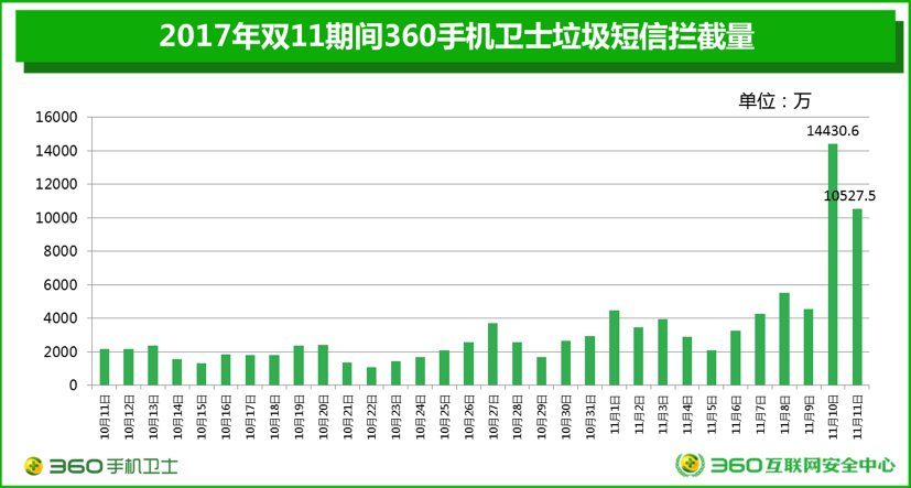 对于各路商家来说,双十一显然是一次不能错过的重大营销机会,因此在2017年双十一期间,商家通过垃圾短信形式进行的商业推广活动也达到了空前的高峰。统计显示,自10月11日-11月11日,360手机卫士平均每天为用户拦截各类垃圾短信3329.1万条,是2017年三季度平均水平(2238.1万条)的1.5倍。其中,垃圾短信的发送最高峰期出现在11月10日,360手机卫士当日共拦截垃圾短信1.44亿条,几乎是三季度日均水平的6.4倍。