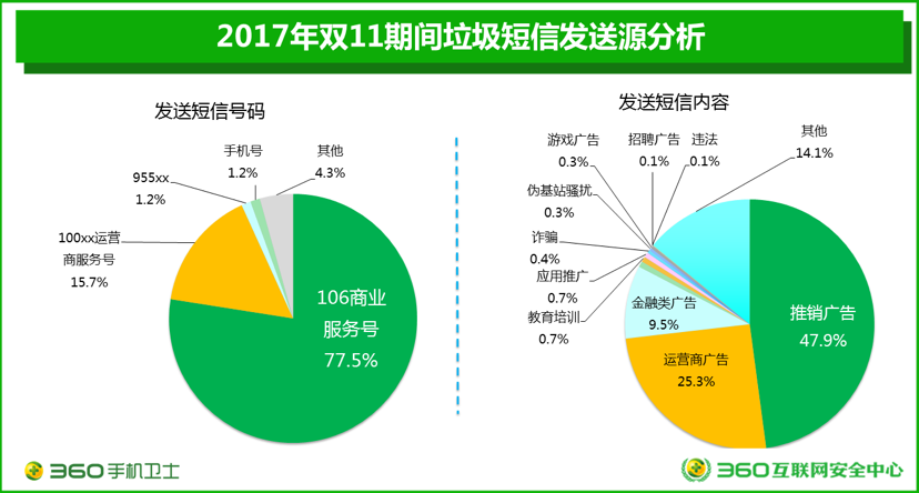 进一步分析可以发现,从发送号码来看,77.5%的垃圾短信是从106开头的商业服务号码发出的,15.7%则是从电信运营商的客服号100XX发出来的。通过对截获的垃圾短信的内容分析,360进一步分析了垃圾短信的发送者的身份。统计显示,电商平台、及电商平台中的店铺、商家是垃圾短信的主要发送者,共占比47.9%,其实运营商占比为25.3%,金融理财类的推广占比为9.5%。