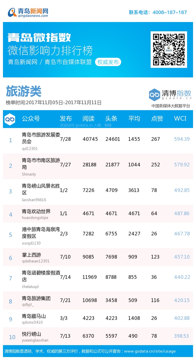由青岛新闻网联合清博指数平台联手打造的“青岛微指数微信影响力排行榜”,通过对各行业微信公众号的日常监测,对所有账号在统计周期内所发布内容的发文总数、总阅读数、头条阅读数、平均阅读数及总点赞数等海量数据进行分析,帮助各行业新媒体小编更好地运营微信。