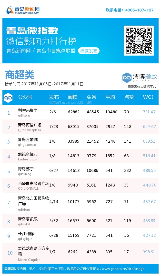由青岛新闻网联合清博指数平台联手打造的“青岛微指数微信影响力排行榜”,通过对各行业微信公众号的日常监测,对所有账号在统计周期内所发布内容的发文总数、总阅读数、头条阅读数、平均阅读数及总点赞数等海量数据进行分析,帮助各行业新媒体小编更好地运营微信。