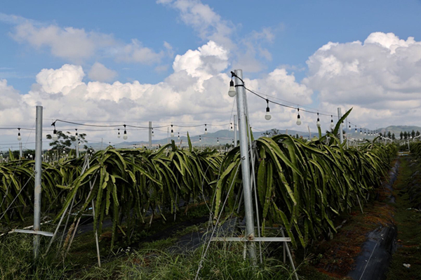 最引人注目的是,每株火龙果顶部都有一盏灯,这是该基地专门设置的“光照调节生产技术”,据介绍该技术的运用可实现果品的全年供应,亩产7000余斤/年,年产量500余万斤。