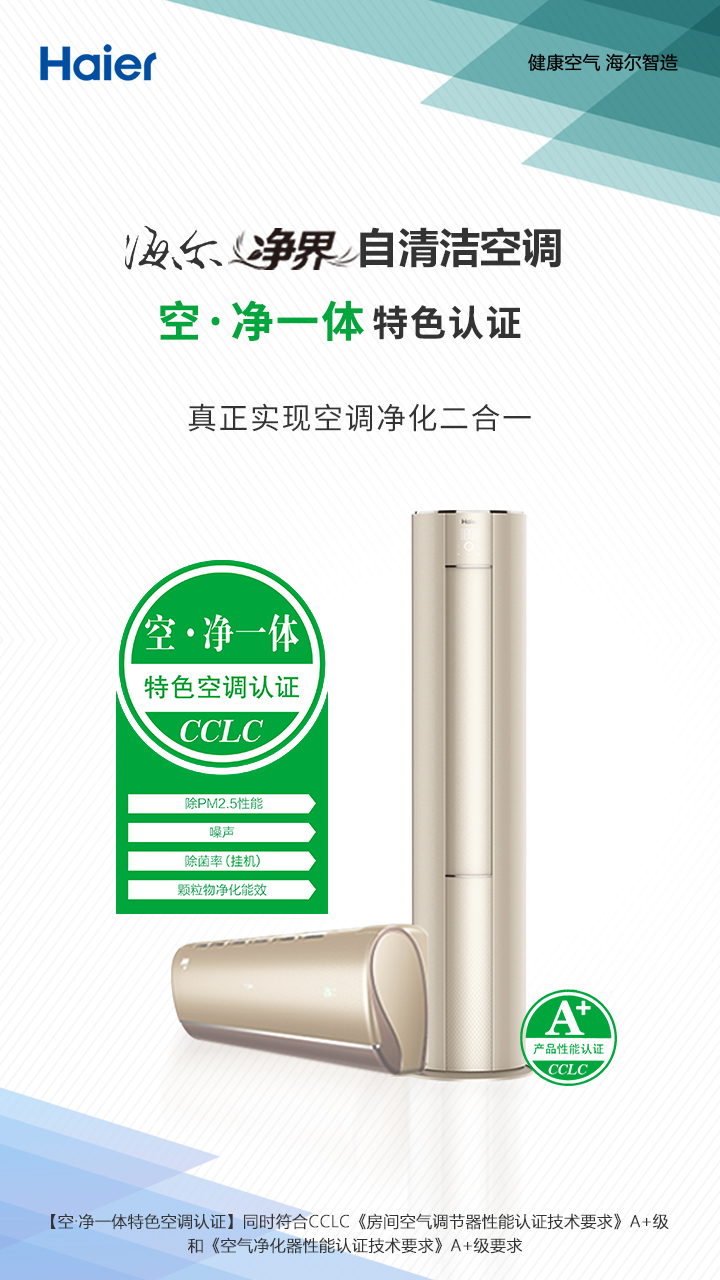 2017年,家电产品新A+认证增加了家电绿色、健康考核,并在空调领域首次增加了净化功能认证。11月17日,记者从海尔空调了解到,海尔净界自清洁空调达到A+产品认证标准。测试结果显示,海尔净界自清洁空调比普通空调净化效果好,比空气净化器还安静,行业唯一获得空调和净化器双品类A+认证,并被授予“空·净一体”特色产品标识。