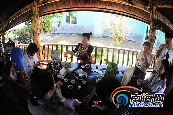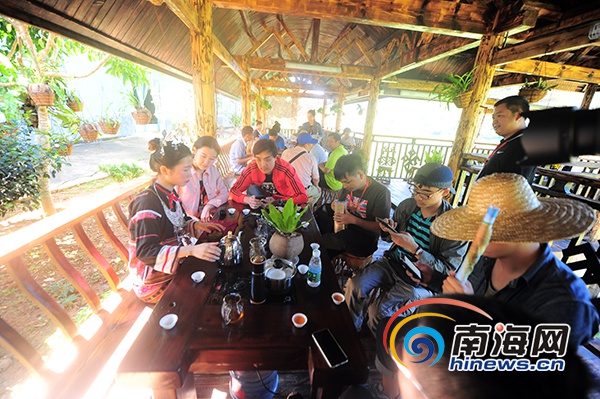 11月17日,“发现美好新海南”2017全国重点网络媒体海南温暖之旅采风团来到五指山市最具代表性茶园之一的椰仙茶园品茶。南海网记者 沙晓峰 摄