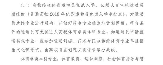 (二)高校接收优秀运动员免试入学,必须认真审核运动员填报的《普通高校2018年优秀运动员免试入学审批表》,对运动员就读专业进行明确,并做好招生专业确定和计划预留;符合条件的运动员可免试进入高校体育学类本科专业,如运动员申请就读其他专业,应参加运动训练、武术与民族传统体育专业单独招生文化课考试,由高校自主划定文化课录取分数线。