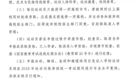 (三)每位运动员只能获得一所高校许可,若被两所以上高校同时批准录取,应在报名前选择一所高校,并主动告知放弃的高校招生部门,征得放弃院校招生部门同意,否则将取消入学资格;