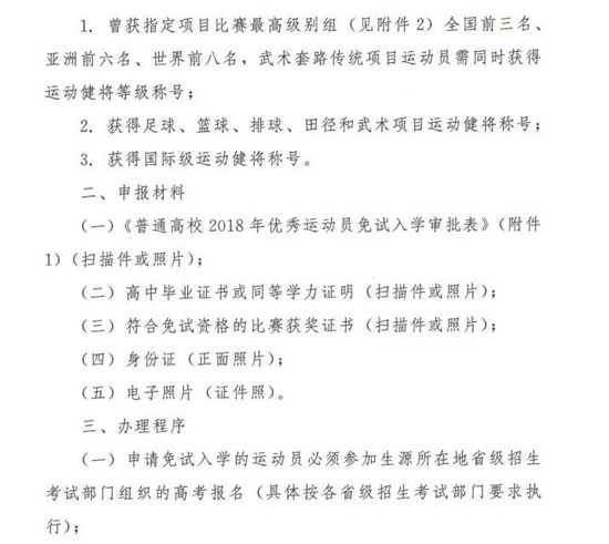 (一)申请免试入学的运动员必须参加生源所在地省级招生考试部门组织的高考报名(具体按各省级招生考试部门要求执行);