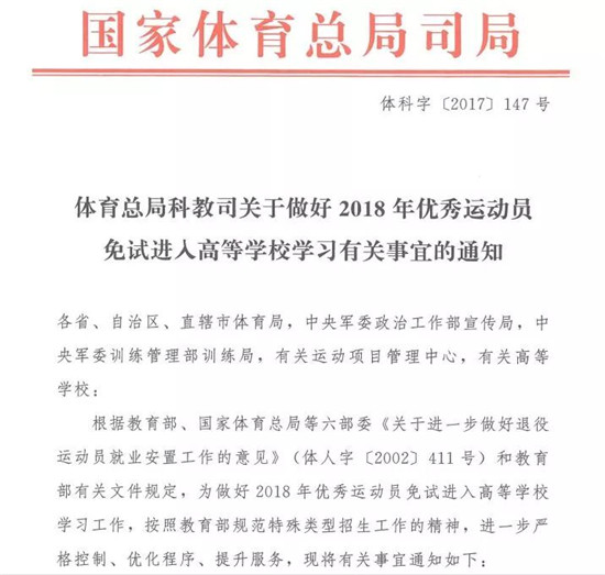 根据教育部、国家体育总局等六部委《关于进一步做好退役运动员就业安置工作的意见》(体人字〔2002〕411号)和教育部有关文件规定,为做好2018年优秀运动员免试进入高等学校学习工作,按照教育部规范特殊类型招生工作的精神,进一步严格控制、优化程序、提升服务,现将有关事宜通知如下: