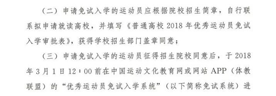 (三)申请免试入学的运动员征得招生院校同意后,于2018年3月1日12:00前在中国运动文化教育网或网站APP(体教联盟)的“优秀运动员免试入学系统”(以下简称免试系统)进行报名,并根据系统要求提交相关资料,逾期不予以受理;