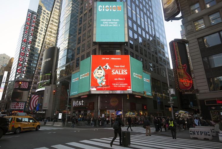 11月22日,海信广告亮相纽约时代广场大屏,全面助力国美“1201年终超级内购会”。中国品牌走向世界,向世界展示中国品牌的魅力。