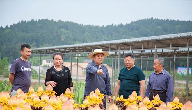 在四川蓬溪县拱市村,蒋乙嘉(中)在为村民讲解千叶佛莲的生长习性。摄影/蒋东宏