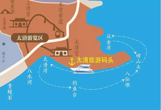游船观光航线:太清码头 –太清湾–钓鱼台 –八仙墩 –崂山头(折返) –太清码头。