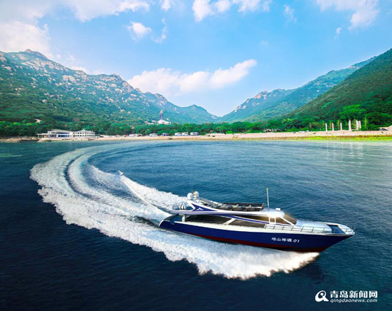 崂山游船:玻璃钢双体高速客船,船长28米,宽6米,92座。