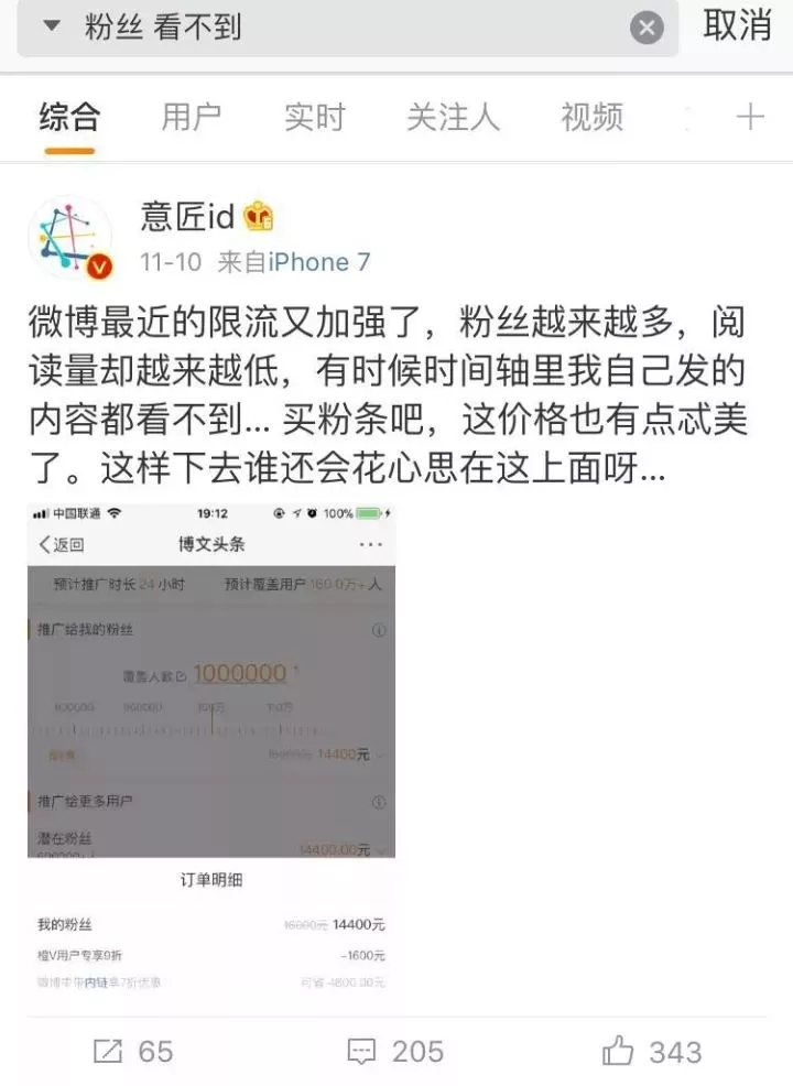 粉丝看不到关注人的微博自然会困惑,但是更加困惑的,是早期为微博带来巨大流量的大V们。从2010年开始玩微博的知名美学设计博主、金V用户“意匠id”吐槽,粉丝越来越多,阅读量却越来越低,有时候时间轴里自己发的内容都看不到。
