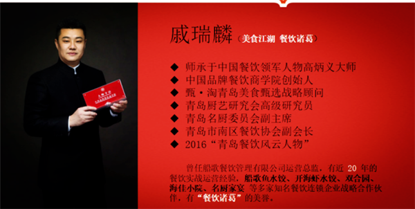“中国品牌餐饮商学院创始人”、“青岛厨艺研究会高级研究员”、“青岛名厨委员会副主席”、“青岛市南区餐饮协会副会长”、“2016青岛餐饮风云人物”等等诸多荣誉和头衔都加诸于戚瑞麟头上,如今他又多了一个身份和使命,作为“甄·淘青岛美食甄选战略顾问”携手甄选师一起甄选打造爆品美食。