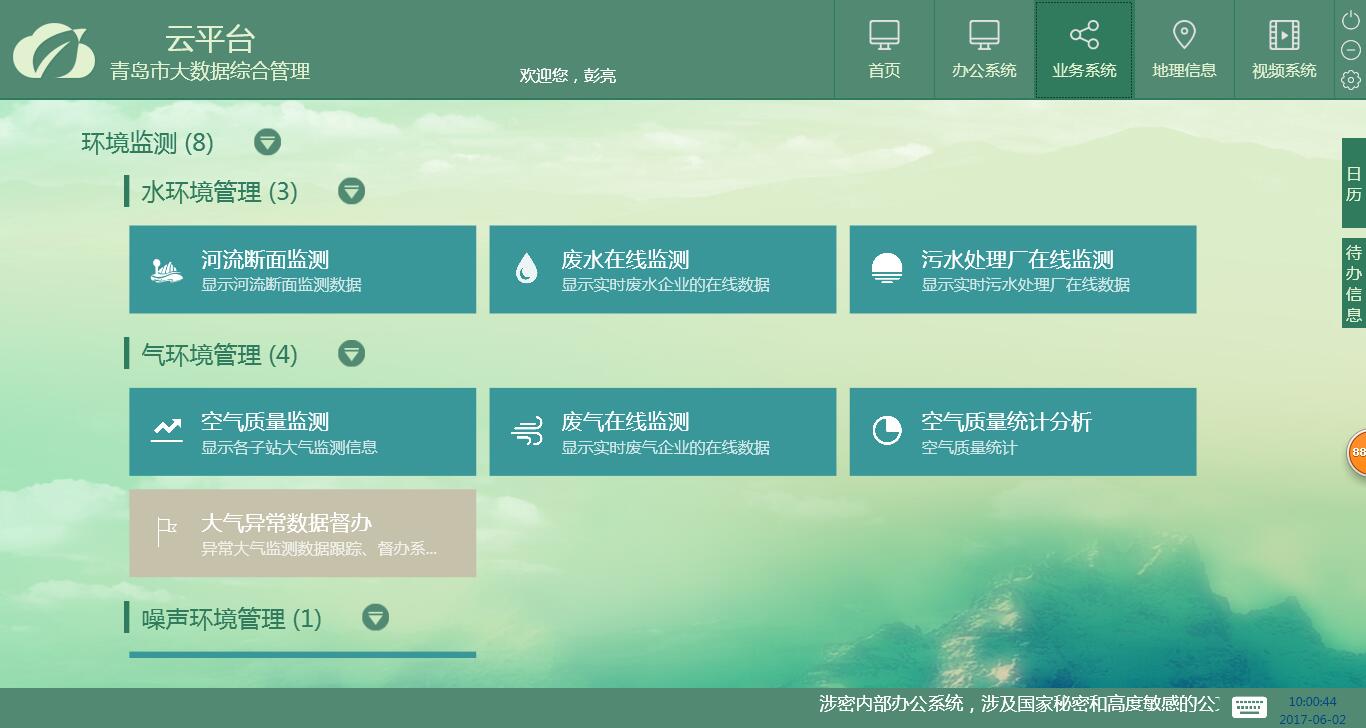 一、平台建设。青岛市环保大数据应用建设项目(以下简称“项目”),从标准规范、数据中心、业务应用三个方面对业务应用进行规范、集中和整合,形成统一平台架构、统一应用服务认证、统一用户管理、统一用户界面的系统格局。项目依托的基础设施,按照云计算理念设计搭建,所有服务器采用虚拟化解决方案。项目建成一个中心、两个平台。一个中心即青岛市环境数据中心,实现了对全市环境数据统一规划分类、集成及运维,为信息公开、环保应用和信息资源共享提供服务;两个平台即大数据综合管理桌面云平台和移动云平台,为业务应用提供支撑服务。