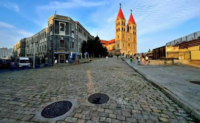 转个弯,沿着斑驳的极具青岛风格的小石板路上行走,广场上的圣弥爱尔教堂格外醒目,庄严、肃穆、彩绘琉璃诉说者关于祈祷的故事。沿沂水路向山顶有红色蘑菇楼的信号山方向前进,可以先看见江苏路基督教堂,钟楼记录着虔诚的朝拜,继续前行,则可以抵达青岛迎宾馆,这也是青岛最著名的建筑之一,德占期间,这里是当年德国驻胶澳总督的官邸,又称提督楼。