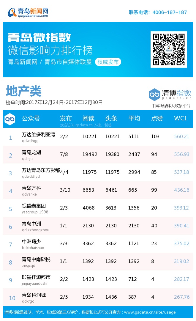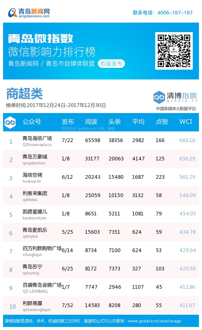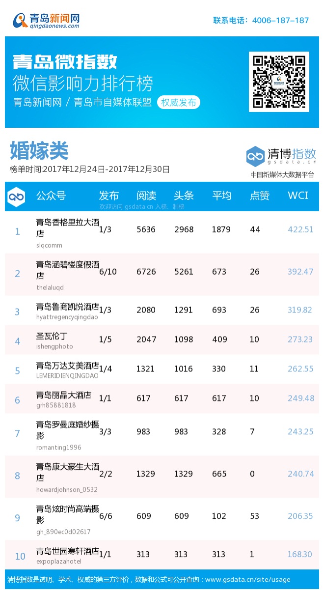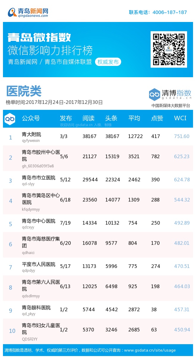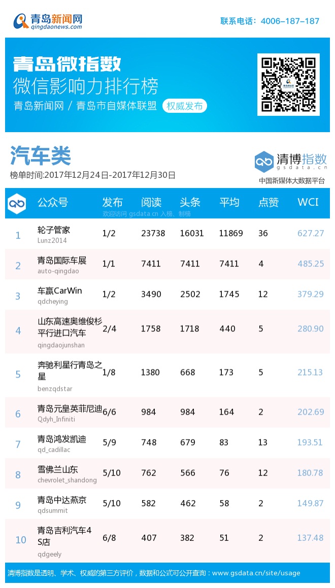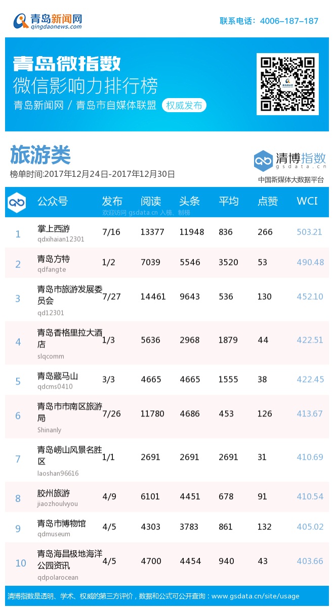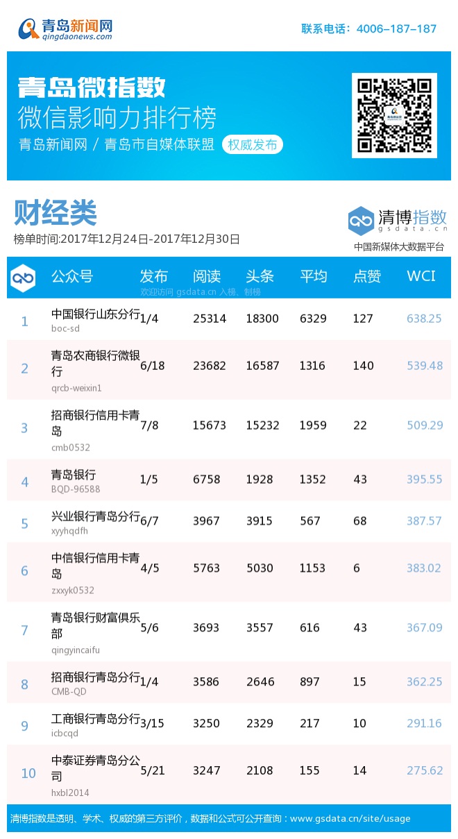 3、本次榜单收录了青岛13个行业微信公众号,如您的账号暂未收录,可联系4006-187-187。
