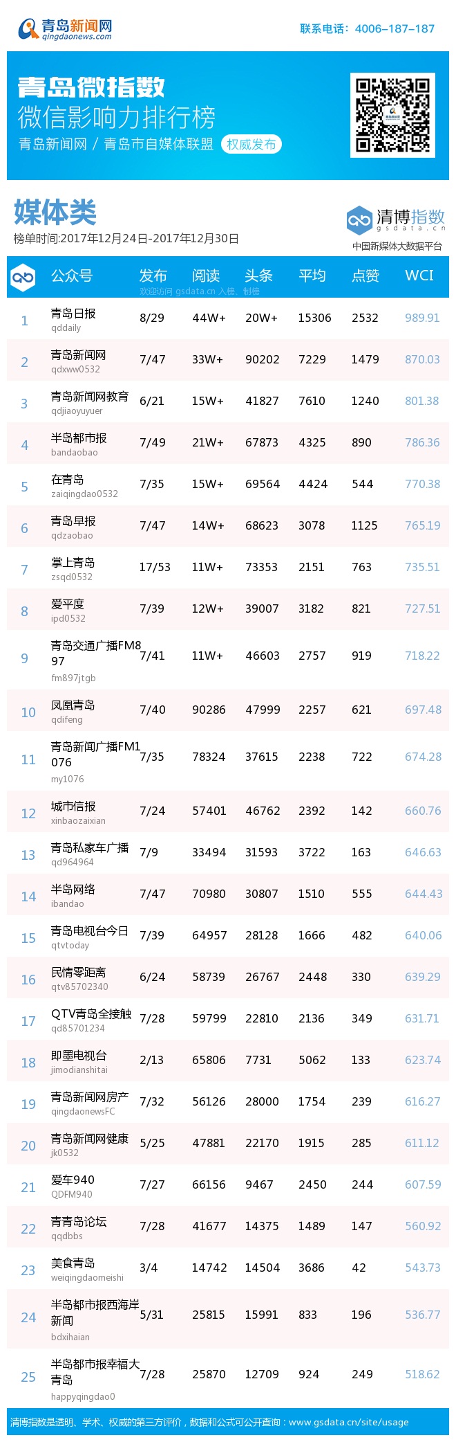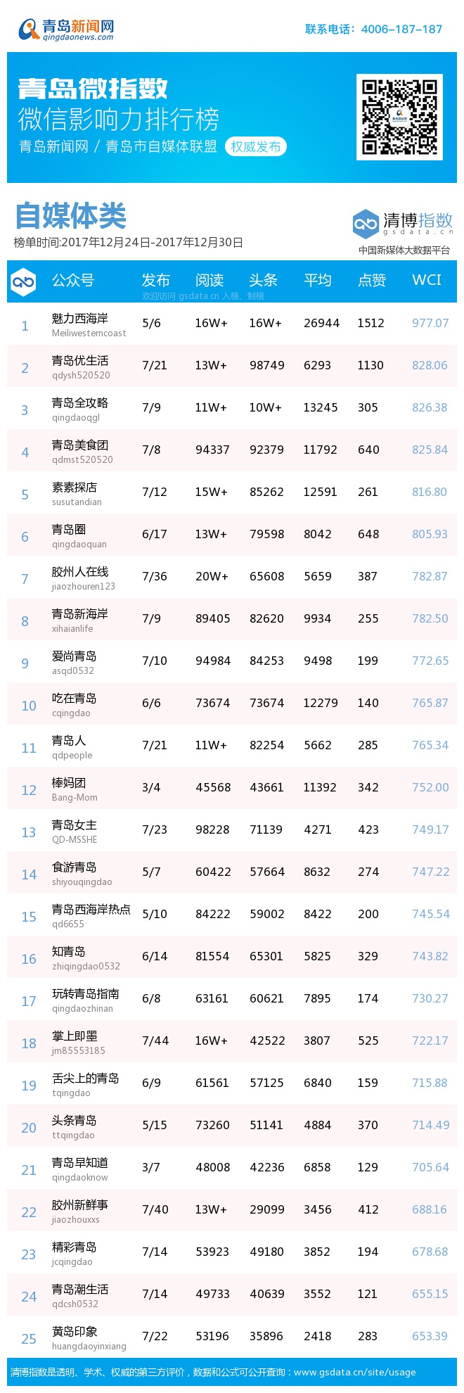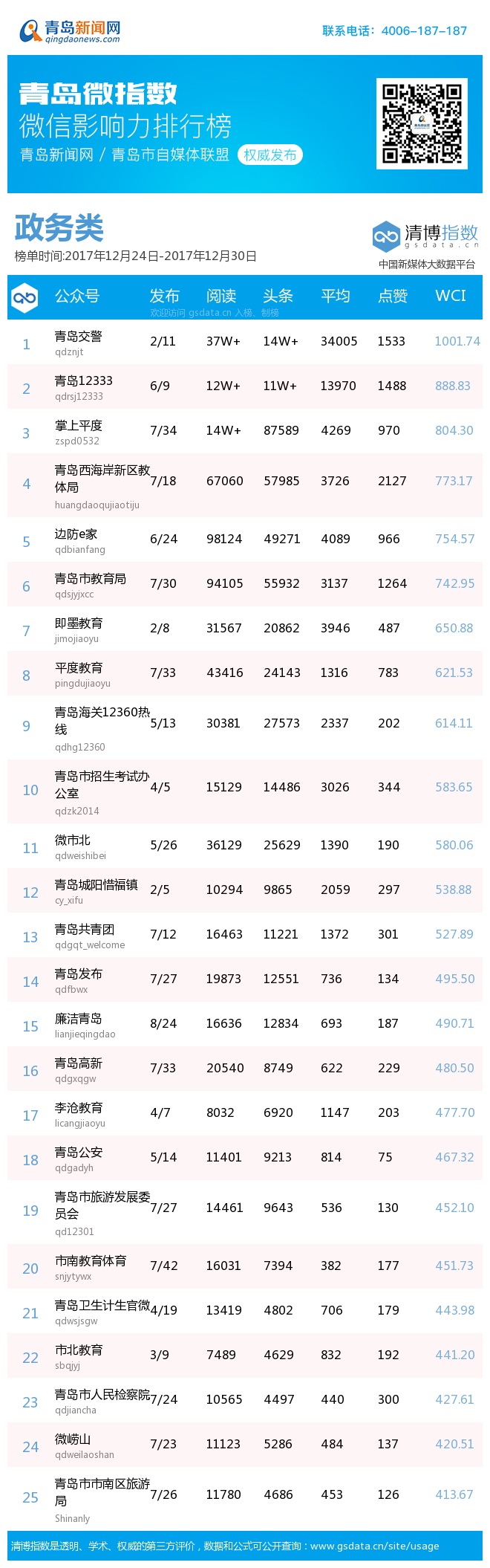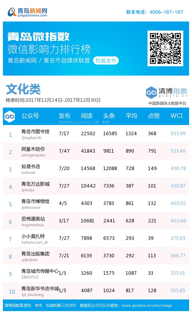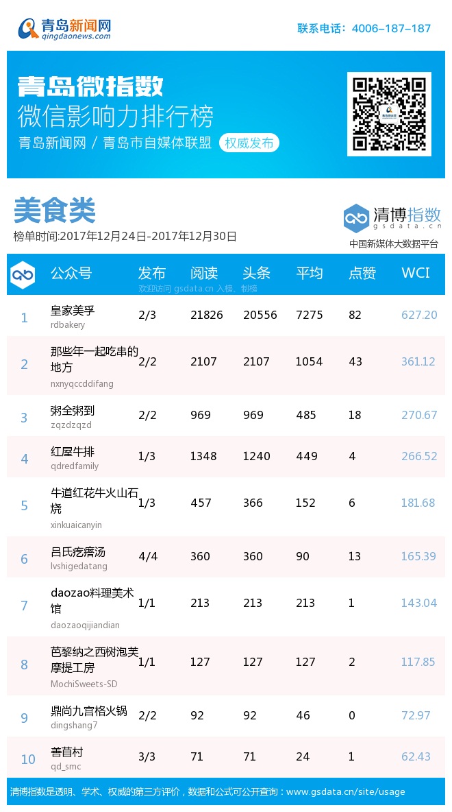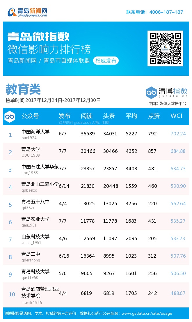 3、本次榜单收录了青岛13个行业微信公众号,如您的账号暂未收录,可联系4006-187-187。
