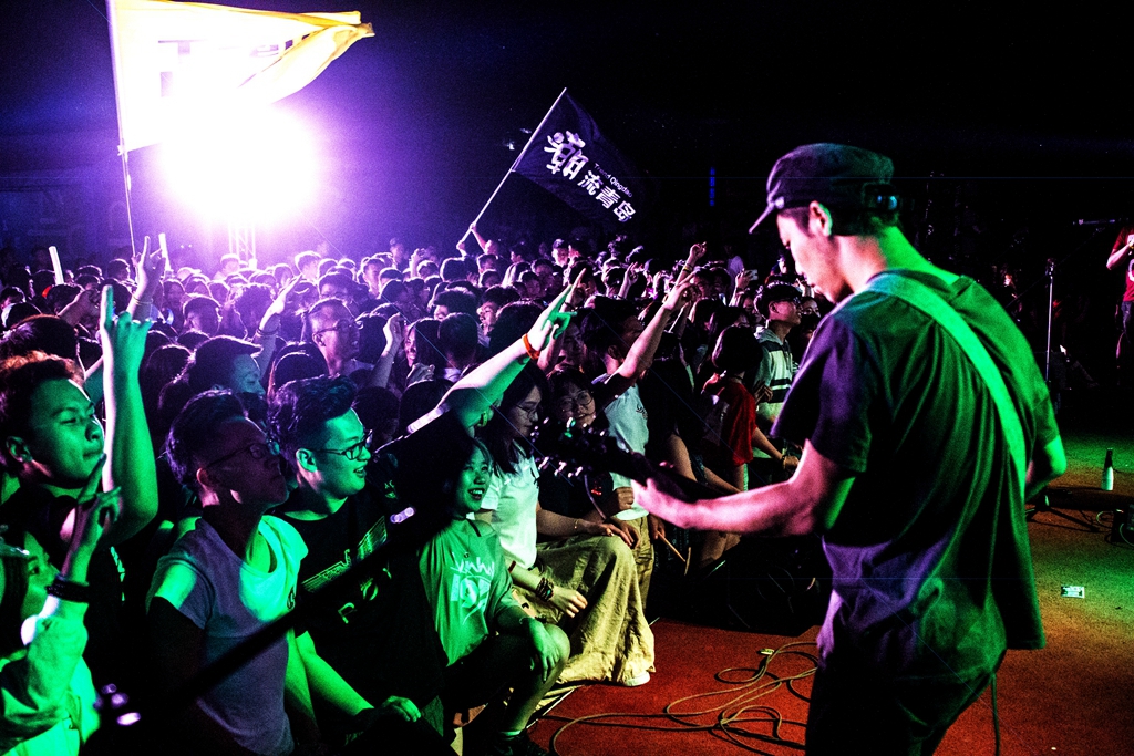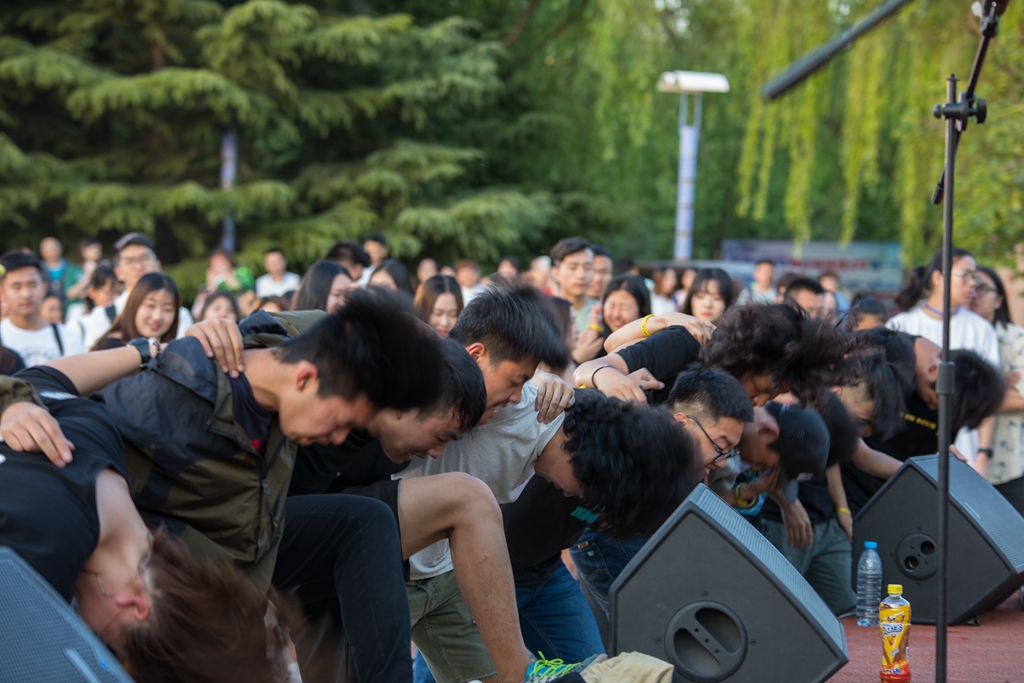 随着夜幕降临,演出现场人群越来越密集,气氛也变得越加躁动。跳水、死墙等,这都是摇滚现场最常上演的玩法之一。虽然在旁人看来这些玩法动作幅度较大,但是在摇滚中,相互保护永远放在第一位。有乐迷在台下全情投入,甚至有人高呼这是“农大迷笛”,乐手们也用最直接的词语称赞了农大校园的摇滚氛围:牛!
