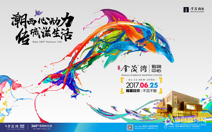 “潮西心动力、传城滋生活”,这句别具青岛特色的金茂湾购物中心开业主题语,也是企划团队花了番心思想出的,既有时尚滨海特色,有充满了浓浓的城市情怀。考虑到金茂湾购物中心是青岛距海最近的购物中心,也是西部城区首个集购物、餐饮、娱乐、健康为一体的购物中心,傍海而生、依海而兴,企划团队选择“潮西”谐音“潮汐”,寓意与海结缘,潮流不息,且有“朝西”的含义,指向青岛的西部;同时又寄以引领潮流,引领西部生活新范式的期望。而“传城”则更多地注重历史文化的传承,植根青岛的发源地,传承其商业母脉和文化基因的意思;并致力于将“360°湾海新生活”一种全新的生活方式传遍全城。
