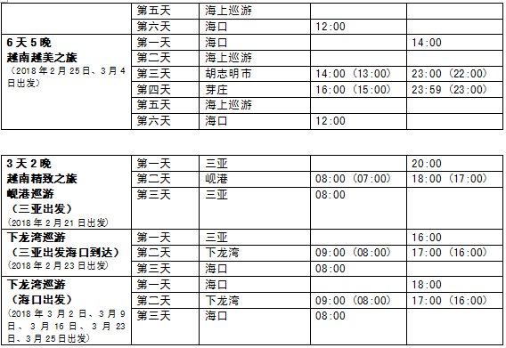 而为了照顾时间不自由的上班族,“双子星号”亦特别准备了3天2晚的周末越南精致之旅。2月21日,旅客可以从三亚登船前往“人生必到的50个景点之一”的岘港,漫步世界最美六大海滩之一;2月23日从三亚出发,或是3月2日、9日、16日、23日及25日从海口出发,旅客可以前往有“海上桂林”之称的下龙湾,探看由1600个岛屿和小岛构成的石灰石柱形独特海景。