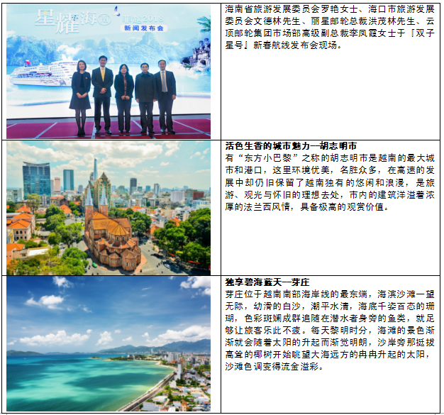 大年初一(2月16日)跟随“双子星号”从三亚出发,旅客可以有“东方小巴黎”之称的胡志明市,漫步于此,旅客可以呢喃着《情人》的词句,哼唱着《西贡小姐》的曲调,感受活色生香的法式风情魅力;而后到达山清水秀的头顿市,流连于白云浅滩,品尝沿海独特的越南风味小吃;最后到达的则是“世界最美的29个海湾之一”芽庄,旅客可以在流光溢彩的细白沙滩戏海逐浪。错过了大年初一的旅客亦可选择于2月25日及3月4日由海口出发的6天5晚越南胡志明市及芽庄悠游之旅。