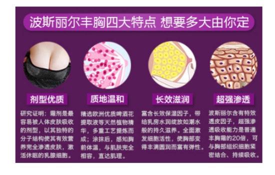 波斯丽尔和普通的美乳霜不同的是,它富含特效透皮促进因子,可自由游离与胸部皮层及乳房组织细胞间隙,渗透吸收能力是普通美乳霜的20倍以上,且本身具有一定吸附能力,可与胸部组织细胞紧密贴合、持续吸收,有效率接近100%吸收。