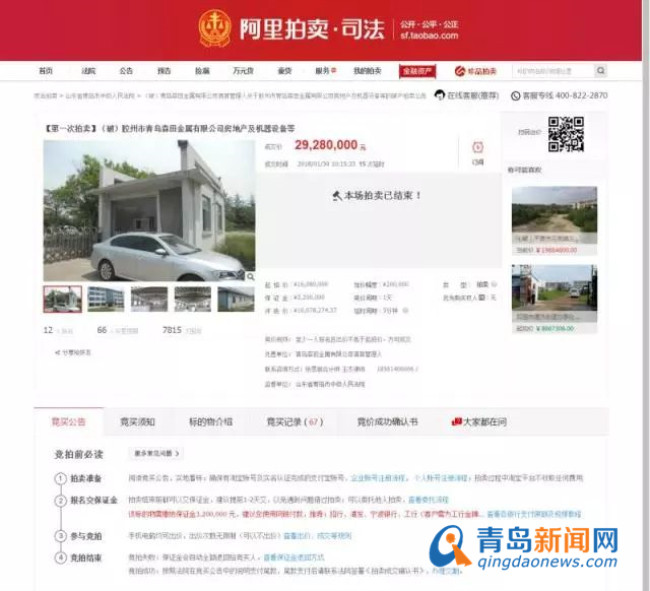 拍卖的标的物是胶州市青岛森田金属有限公司房地产、机器设备、车辆和原材料等,起拍价是1608万元,有12家企业参与网上竞拍,经过67轮激烈角逐,最终成功竞买者以2928万元的价格拍得,溢价率为82%,目前拍卖款已全部到位。
