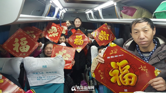 记者看到,每辆客车前都有标注目的地的牌子,有河南的濮阳、新县、范县,河北的邯郸、邢台以及省内的商河、济南、菏泽、鄄城、济宁。为了让务工人员带上祝福回家,车站的工作人员还准备了福字、对联和狗年玩偶送给大家。