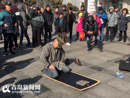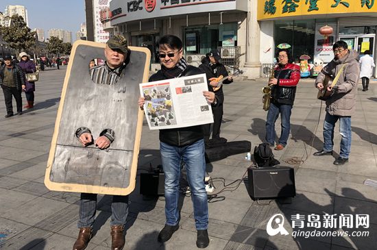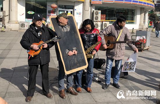 2月11日上午,一场名为“介质——留住的风”的行为艺术在昌乐路文化市场举行。当天现场,艺术家石学金将一块类似手机的纸板做成枷锁的样子,将自己套住,来表达被手机“束缚”的人生,旁边三位艺术家配以音乐演奏,吸引了许多市民围观。