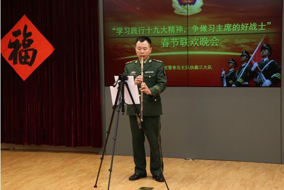 歌舞激昂的旋律、小品动人的情结以及快板轻快的跳跃,高潮一个接着一个,“燃”爆了全场,现场气氛融洽热烈、生动感人;演出现场,大队教导员曾海彬给战友们表演了洞箫独奏《牧羊曲》,为官兵送来了新春的祝福和欢乐。