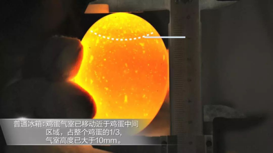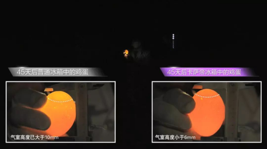普通冰箱内鸡蛋气室已移动近于鸡蛋中间区域,占整个鸡蛋的1/3,气室高度已大于10mm;卡萨帝F+冰箱内鸡蛋气室从大头蛋壳方向向小头方向有一定位移,气室高度小于6mm,2台冰箱的保鲜情况显而易见。