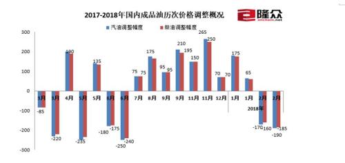 2017-2018年国内成品油历次价格调整概况。来源:隆众资讯