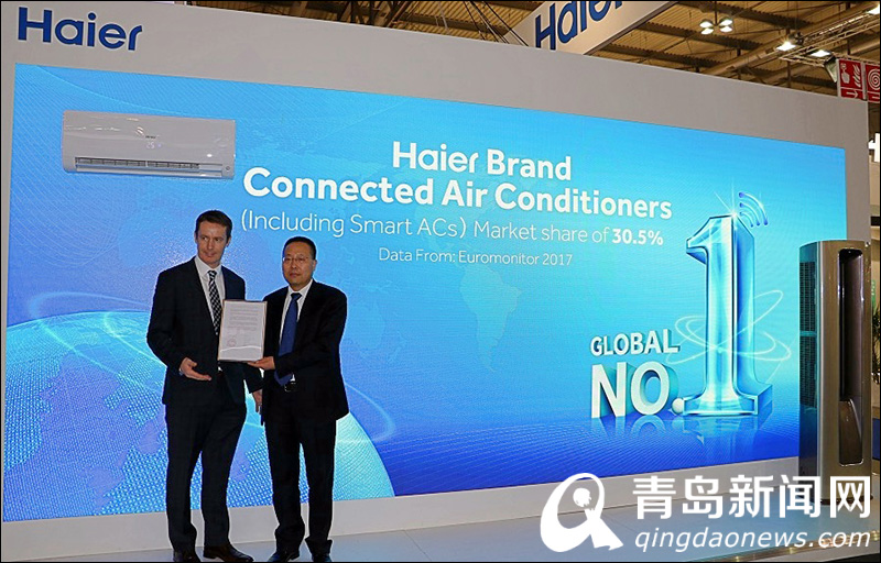 意大利时间3月13日,2018米兰国际供暖、空调、制冷、再生能源及太阳能博览会(MCE)正式开幕。在MCE上,世界权威市场调研机构欧睿国际(Euromonitor)调研总监David Cleveland现场为海尔空调颁发认证--按2017年度零售市场销量台数计,海尔是位列全球第一的互联空调(包括智能空调)品牌,其所占市场份额为30.5%。这也是海尔连续2年位居全球互联空调(包括智能空调)销量榜单第一名。同时,海尔凭借自主品牌全球化也成为欧洲中国空调第一品牌。