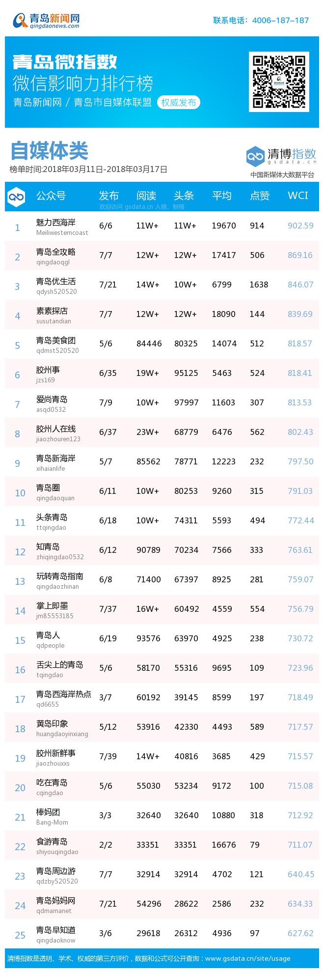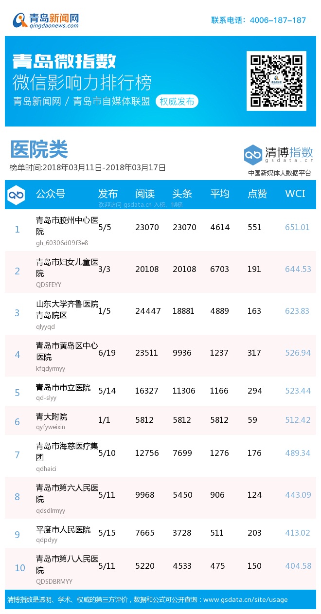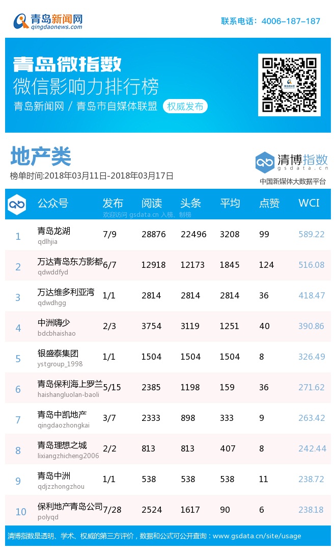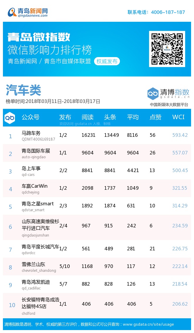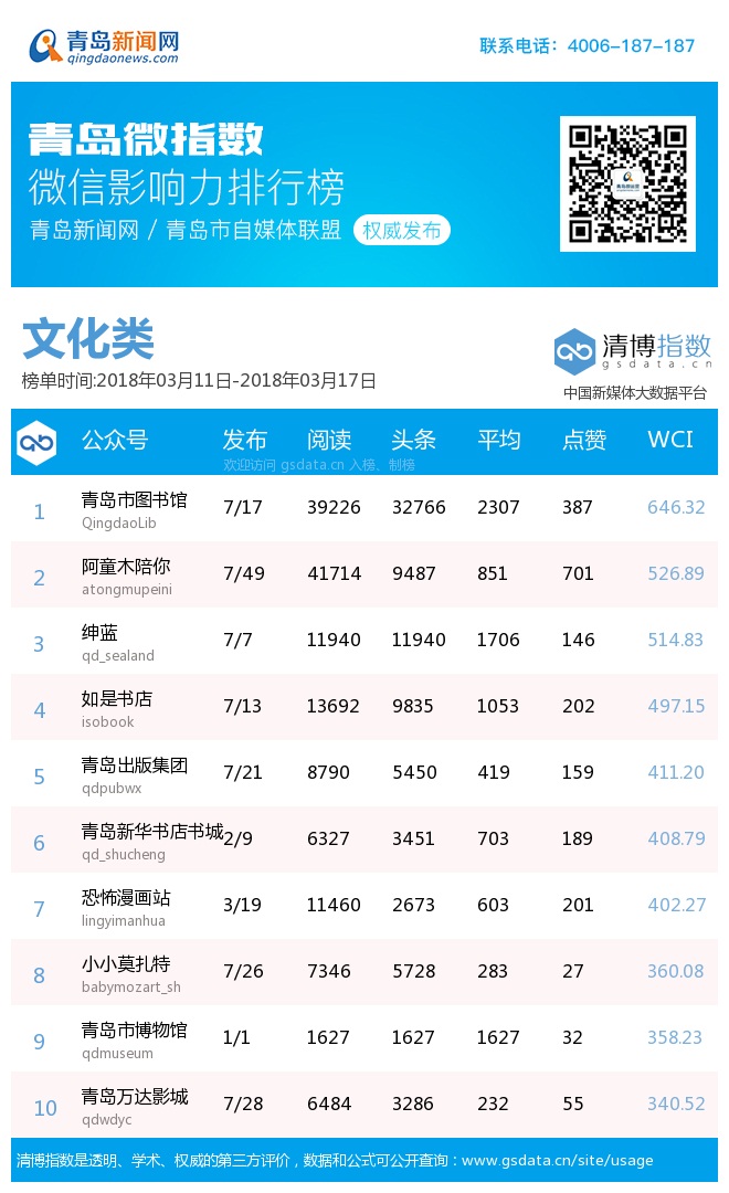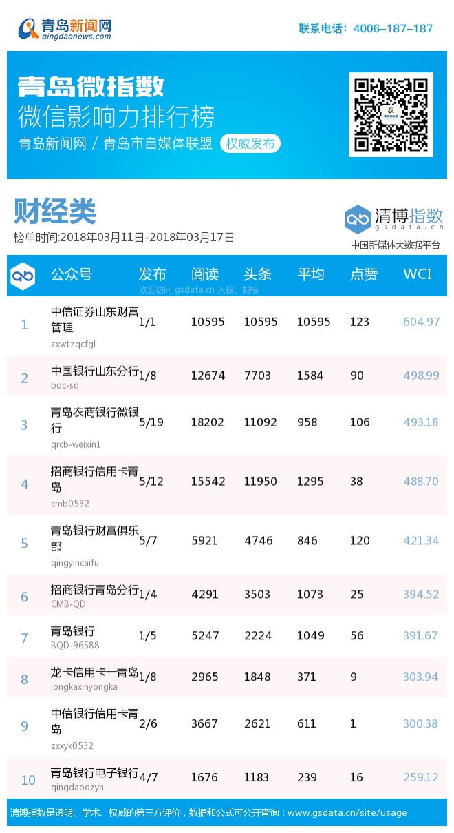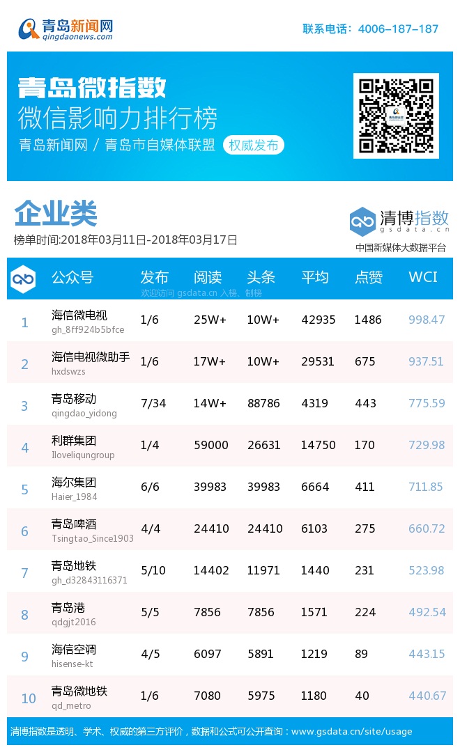 3、本次榜单收录了青岛14个行业微信公众号,如您的账号暂未收录,可联系4006-187-187。
