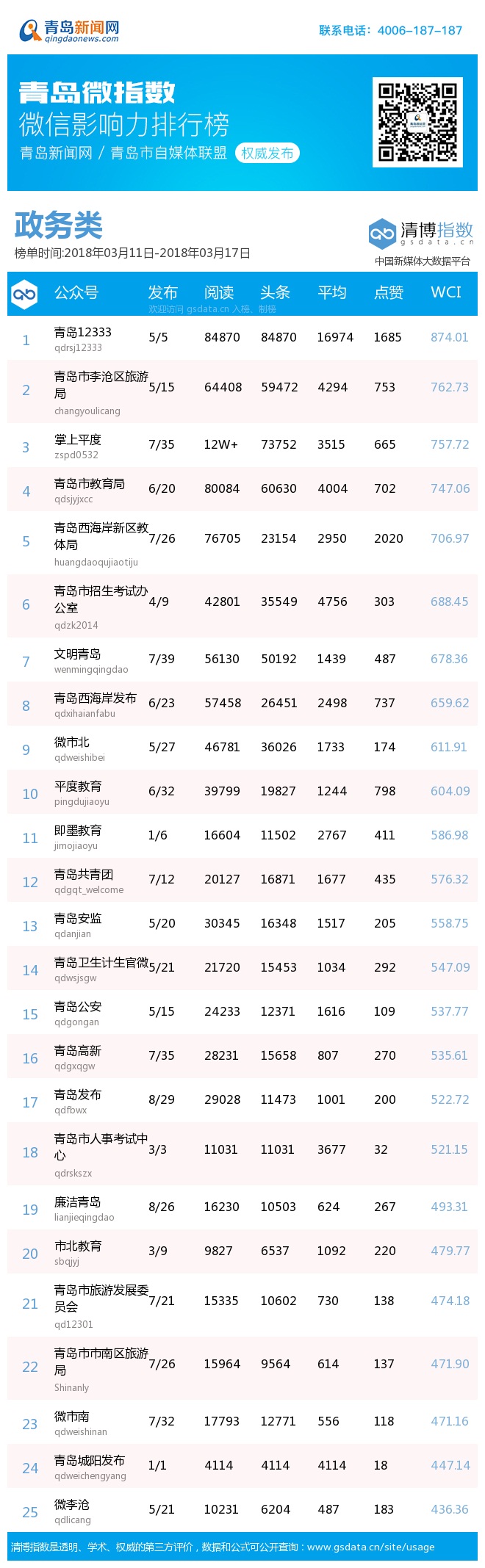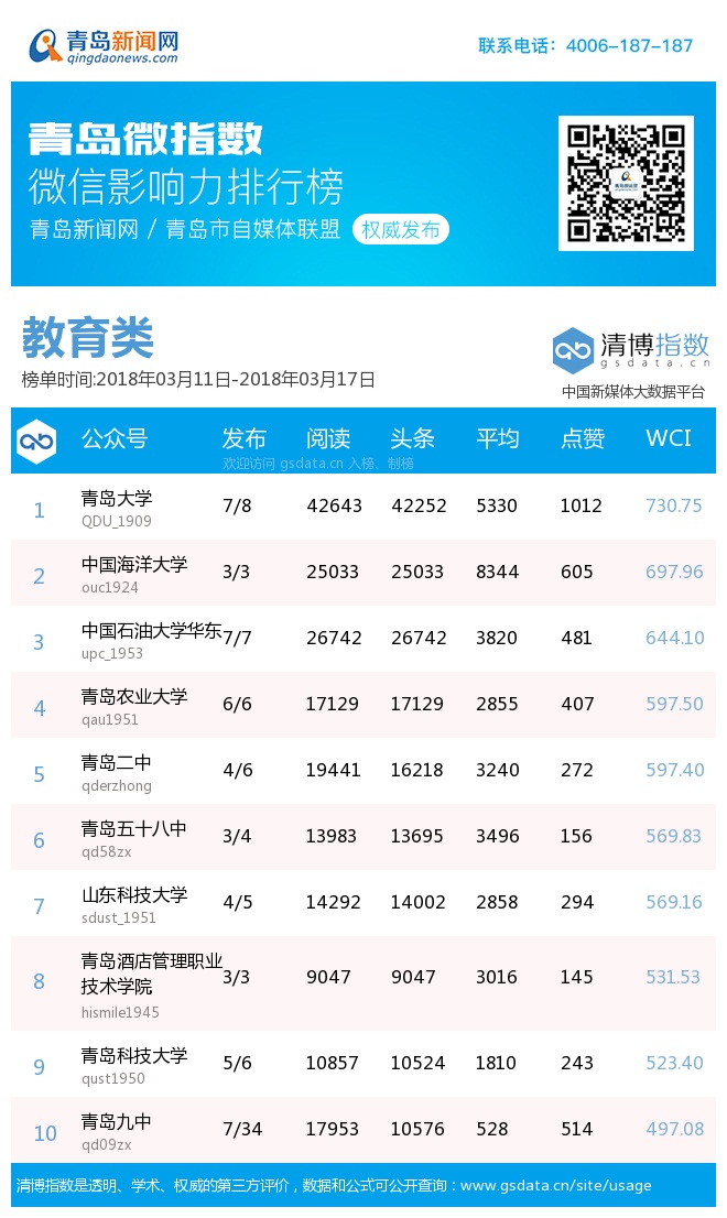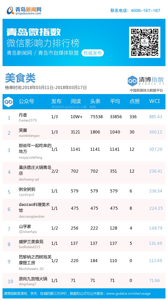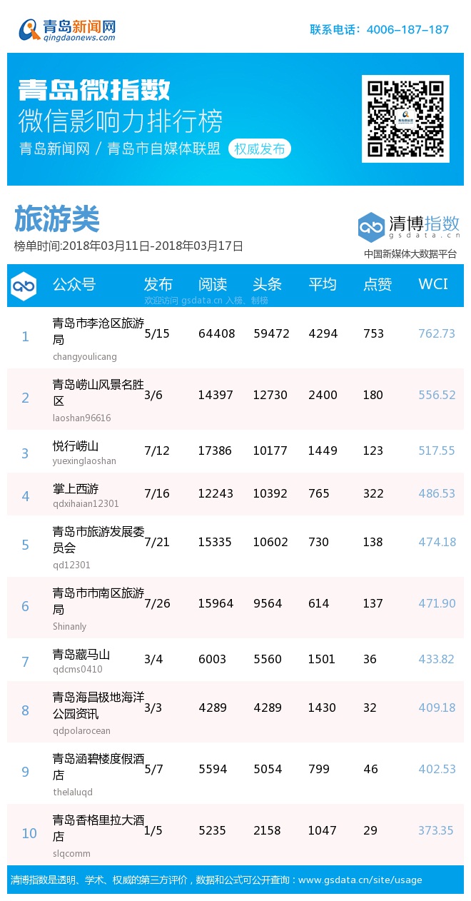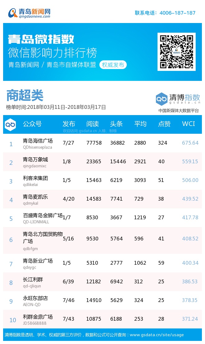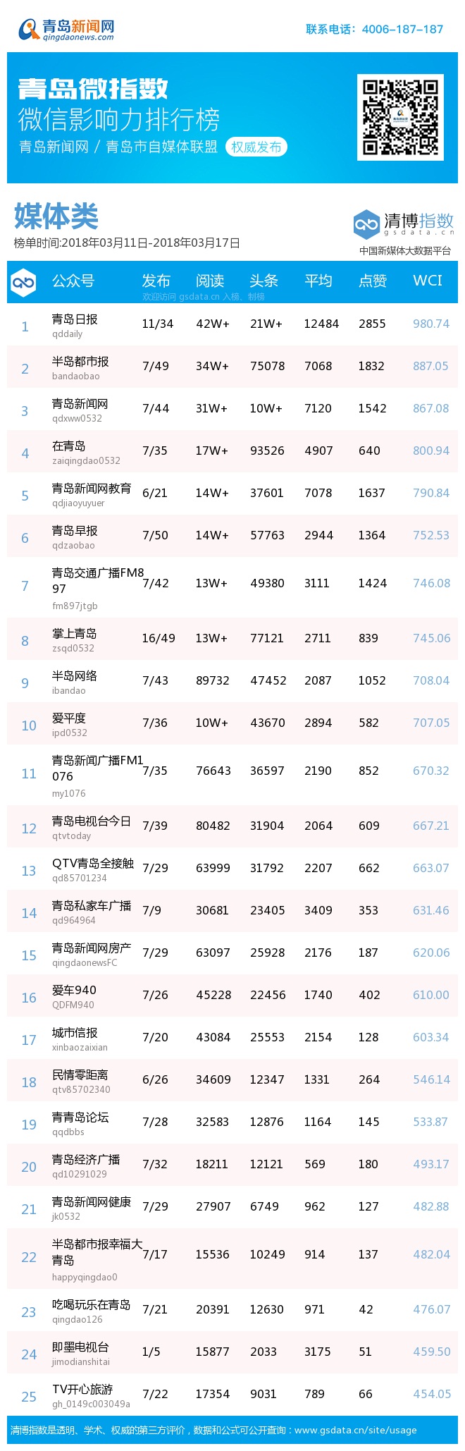 3、本次榜单收录了青岛14个行业微信公众号,如您的账号暂未收录,可联系4006-187-187。