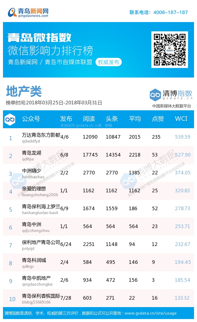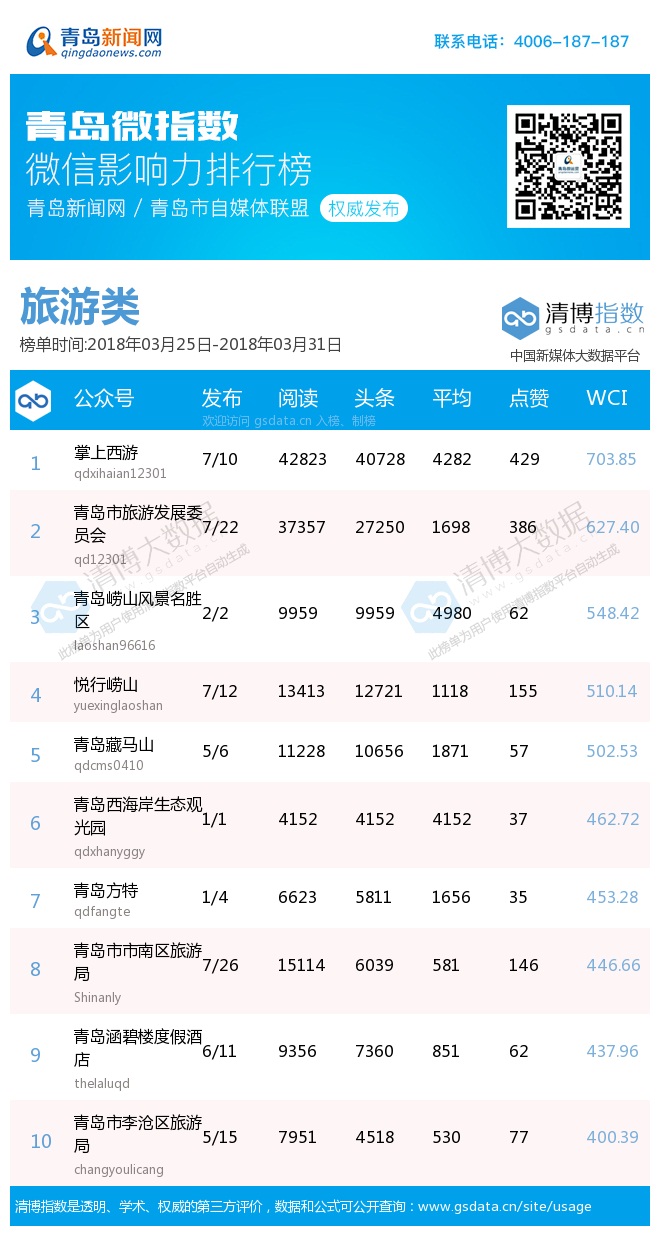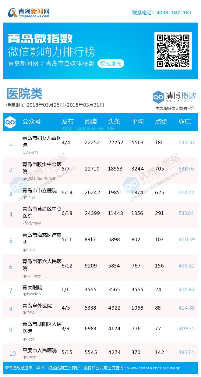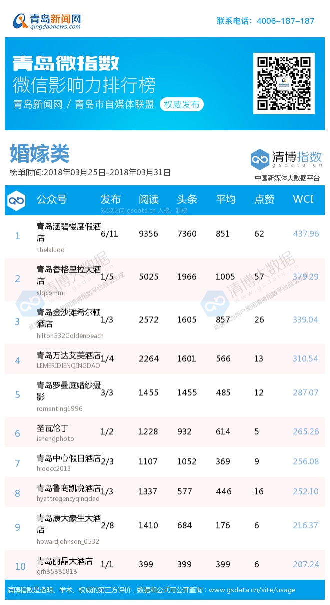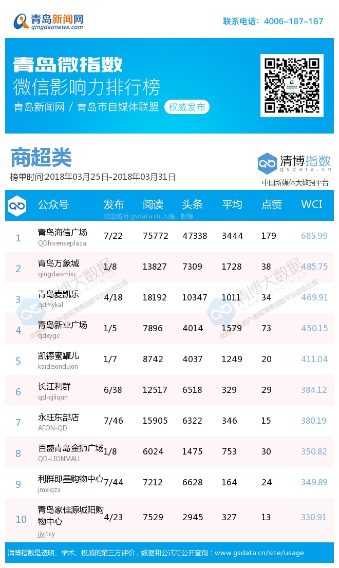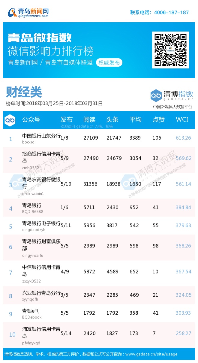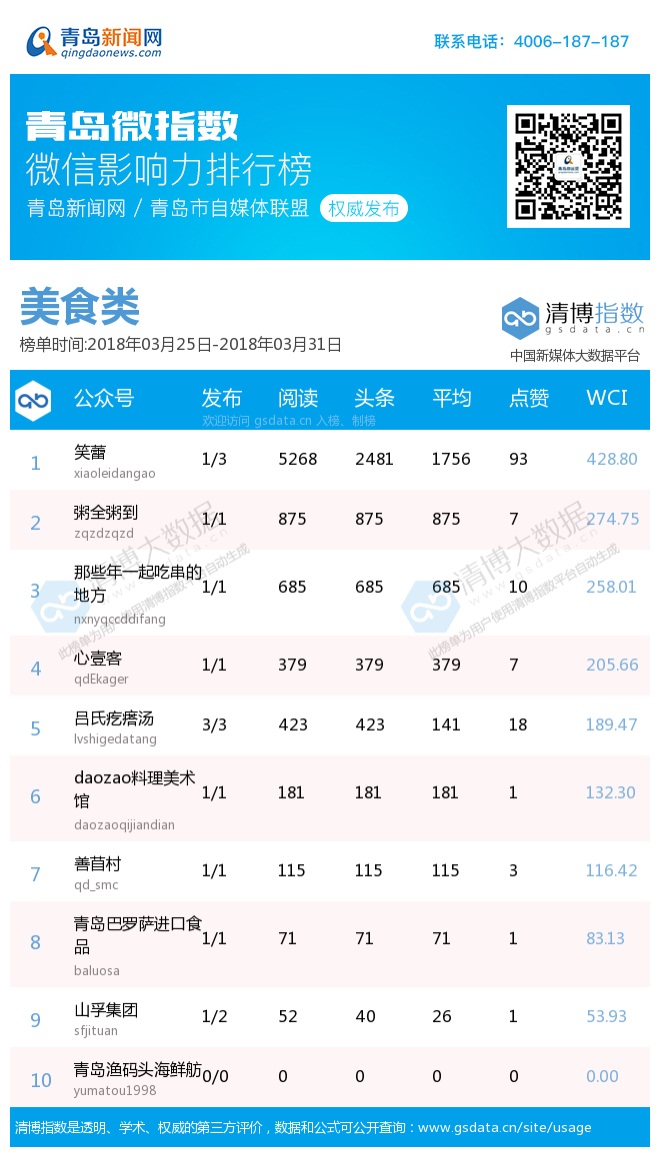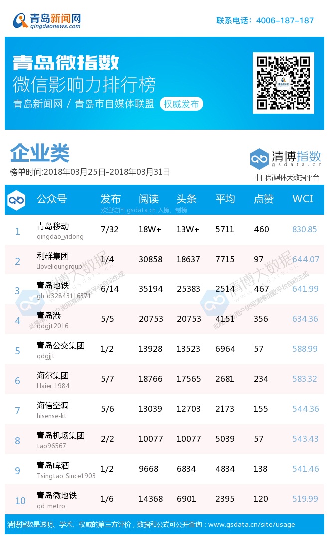 3、本次榜单收录了青岛14个行业微信公众号,如您的账号暂未收录,可联系4006-187-187。